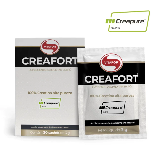 CREAFORT Vitafor é um suplemento alimentar que segue os padrões de mais alta pureza, composto por creatina monohidratada Creapure® originalmente da Alemanha. A creatina auxilia no aumento do desempenho físico durante exercícios repetidos de curta duração e alta intensidade.