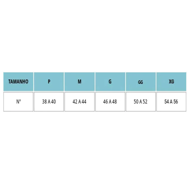 Tamanhos: P - 38/40 M - 42/44 G - 46/48 GG - 50/52