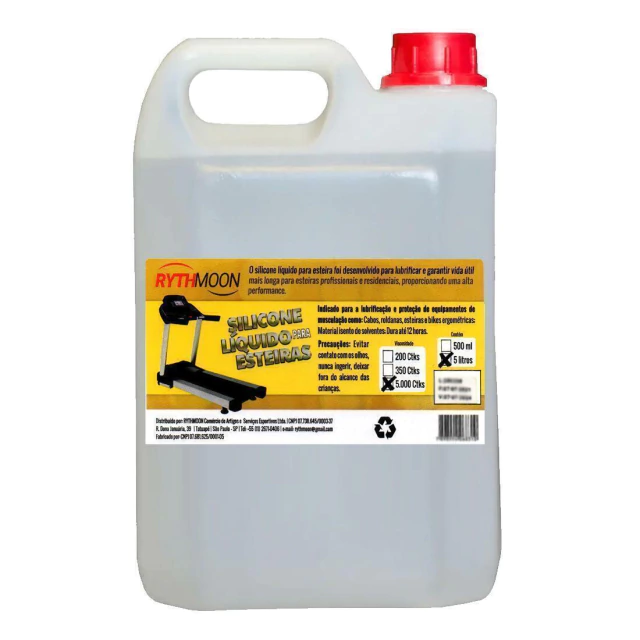 Conteúdo da Embalagem: 01 un. Silicone Líquido para Esteira 5 Lts. Densidade 5000 Rythmoon Todas as informações divulgadas são de responsabilidade do fabricante/fornecedor. Imagem meramente ilustrativa.
